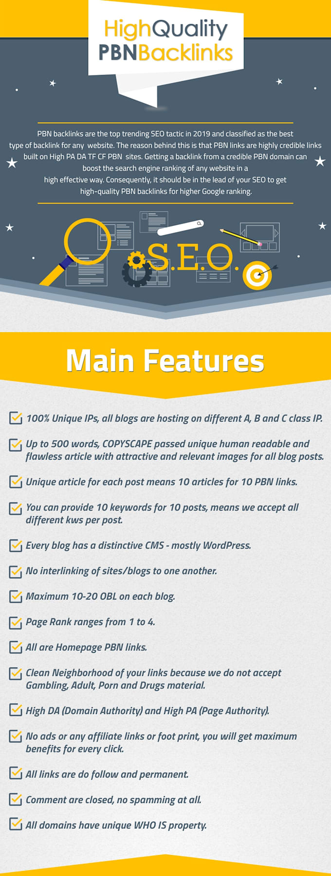 Manually Created PBN BACKLINKS From High Quality PA DA CF TF Domains To Rank Your Website High on Google. PBN Backlinks are thr top trending SEO tactics in 2019 and are classified as the best type of backlink